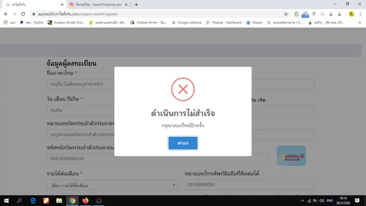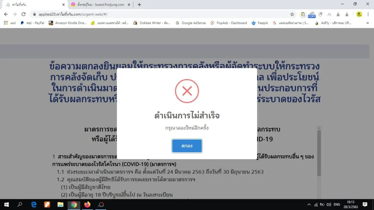 www.เราไม่ทิ้งกัน.com ระบบพังไม่เป็นท่า เพราะไม่สามารถลงทะเบียนกรอกข้อมูลอะไรได้เลย มันจะขึ้นแต่ว่าดำเนินการไม่สำเร็จ ตามรูปที่แนบมา ถ้าระบบยังเป็นอย่างนี้รับรองว่าคนจะยิ่งแห่กันไปลงทะเบียนที่ธนาคารอย่างแน่นอน