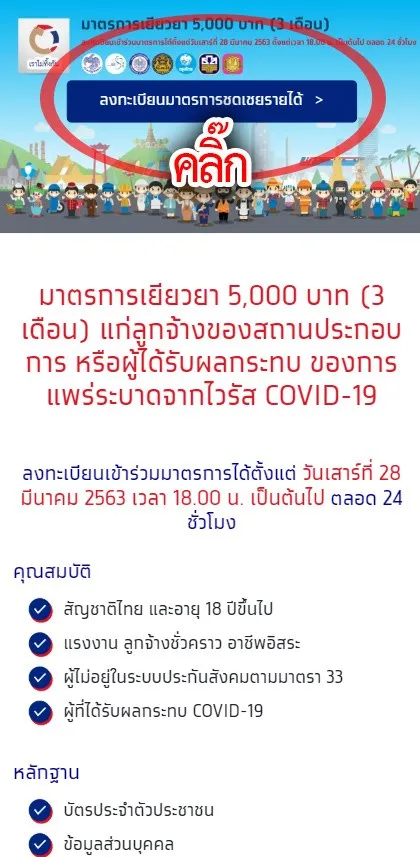 28 มีนาคม 2563 เวลา 18.00 น. เว็บไซต์ www.เราไม่ทิ้งกัน.com เปิดให้พี่น้องชาวไทยที่ได้รับผลกระทบจากเหตุการณ์ระบาดของไวรัสโควิด 19 ได้ลงทะเบียนขอรับเงินช่วยเหลือเดือนละ 5,000 บาท โดยต้องเข้าหลักเกณท์ที่กำหนดดังนี้
