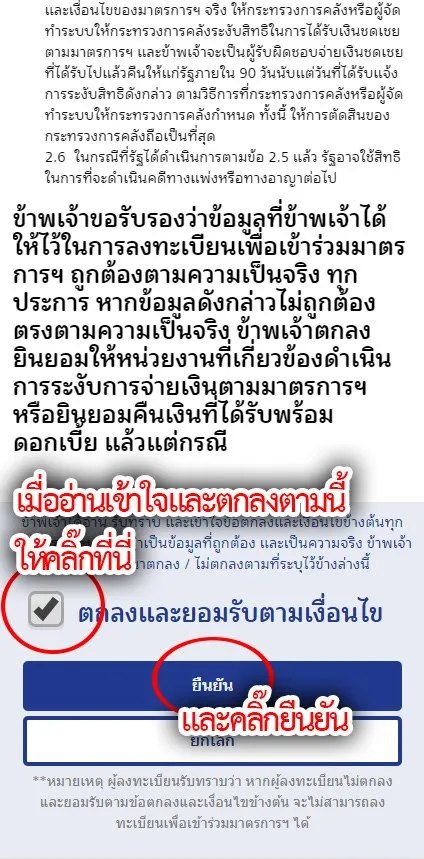 จากนั้นก็อ่านข้อตกลง เมื่ออ่านเข้าใจและยอมรับตามนั้นแล้ว ก็ให้ติ๊กที่ช่อง "ตกลง" และกด "ยืนยัน"