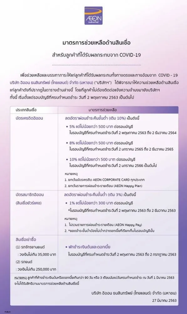 วันที่ 28 มีนาคม 2563 เพจ AEON Thana Sinsap ออกประกาศว่า เพื่อช่วยเหลือและบรรเทาภาระให้แก่ลูกค้าที่ได้รับผลกระทบทั้งทางตรงและทางอ้อมจาก COVID-19 บริษัท อิออน ธนสินทรัพย์ (ไทยแลนด์) จำกัด (มหาชน) (บริษัทฯ)ได้พิจารณาให้ความช่วยเหลือด้านสินเชื่อแก่ลูกค้าดังที่ปรากฏในตารางด้านล่างนี้ โดยที่ลูกค้าไม่ต้องติดต่อแจ้งความจำนงมายังบริษัทฯ ทั้งนี้ มาตรการนี้เริ่มตั้งแต่วันที่ 1 เมษายน 2563 ซึ่งจะครบกำหนดชำระ วันที่ 2 พฤษภาคม 2563 เป็นต้นไป