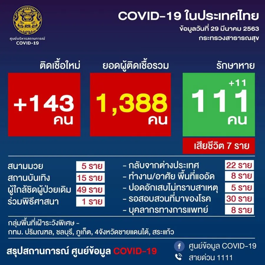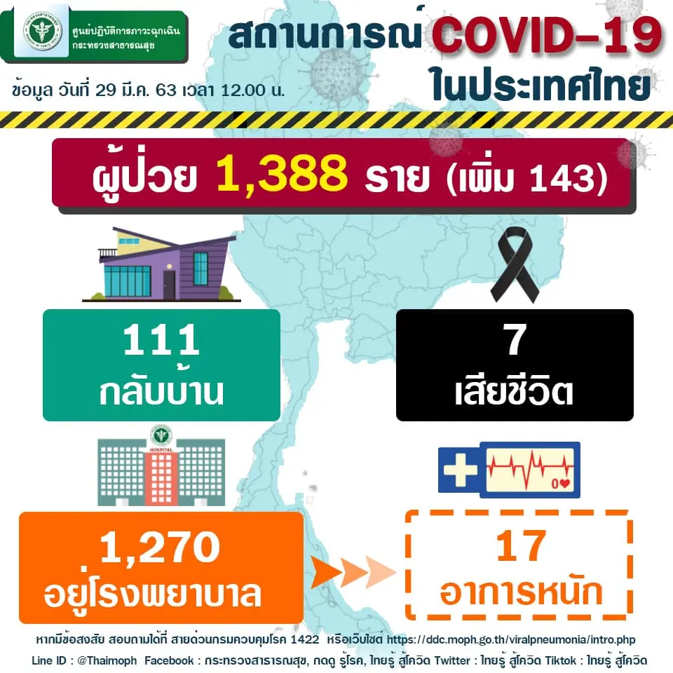 29 มีนาคม 2563 สธ.แถลงยืนยันพบผู้ป่วย โควิด19 เพิ่มอีก 143 คน เสียชีวิตเพิ่ม 1 ราย เป็นชาย วัย 68 ปี นนทบุรี เกี่ยวข้องกับสนามมวย รวมผู้ติดเชื้อสะสม 1,388 คน เสียชีวิต 7 ราย