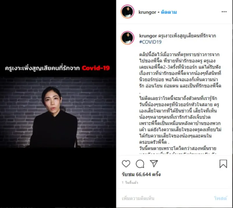 ไม่คิดเลยว่าโรคนี้จะมาถึงตัวคนที่เรารู้จัก วันนี้น้องๆของครูที่นิวยอร์กหัวใจสลาย ครูเองเสียใจมากที่ได้ยินข่าวนี้ เสียใจที่เห็นน้องๆหลายๆคนที่เรารักกำลังเจ็บปวด เพราะพี่จี๊ดเป็นเหมือนหลังคาบ้านของพวกเค้า แต่ยังไงความเสียใจของครูคงเทียบไม่ได้กับความเสียใจของน้องๆและคนในครอบครัวพี่จี๊ด วันนี้คนเสียชีวิตเพราะโควิดกว่าสองหมื่นรายและยังคงเพิ่มอีกถ้าเรายังประมาทกัน ยังต้องมีคนเจ็บปวดจากการจากพรากอีกกี่แสนชีวิต