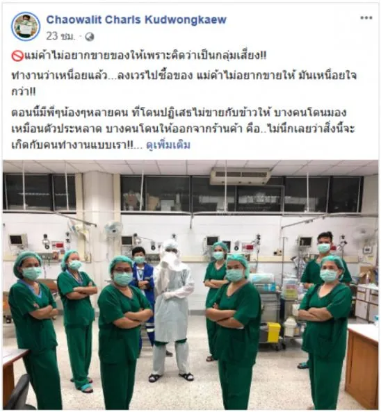มีรายงานว่า ผู้ใช้เฟซบุ๊กชื่อ Chaowalit Charls Kudwongkaew ได้ออกมาโพสต์ระบายความในใจ เป็นกระบอกเสียงแทนเพื่อนร่วมงาน หลังถูกแม่ค้าปฏิเสธขายข้าวให้ โดยระบุข้อความว่า แม่ค้าไม่อยากขายของให้เพราะคิดว่าเป็นกลุ่มเสี่ยง ทำงานว่าเหนื่อยแล้ว ลงเวรไปซื้อของ แม่ค้าไม่อยากขายให้ มันเหนื่อยใจกว่า ตอนนี้มีพี่ๆน้องๆหลายคน ที่โดนปฏิเสธไม่ขายกับข้าวให้ บางคนโดนมองเหมือนตัวประหลาด บางคนโดนให้ออกจากร้านค้า