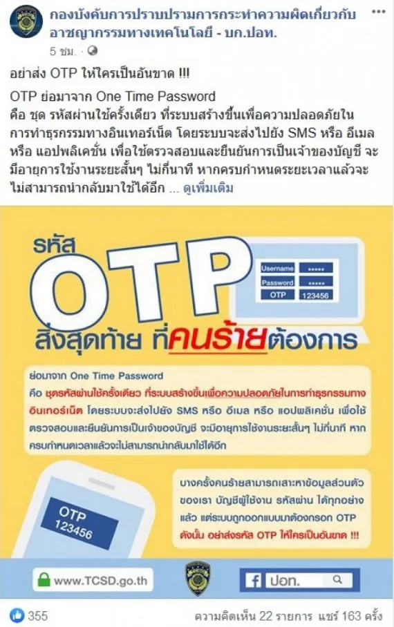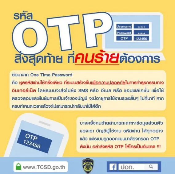 กองปราบเตือน ห้ามส่งรหัส OTP และรหัสหลังบ้ตรประชาชนให้ใครเด็ดขาด