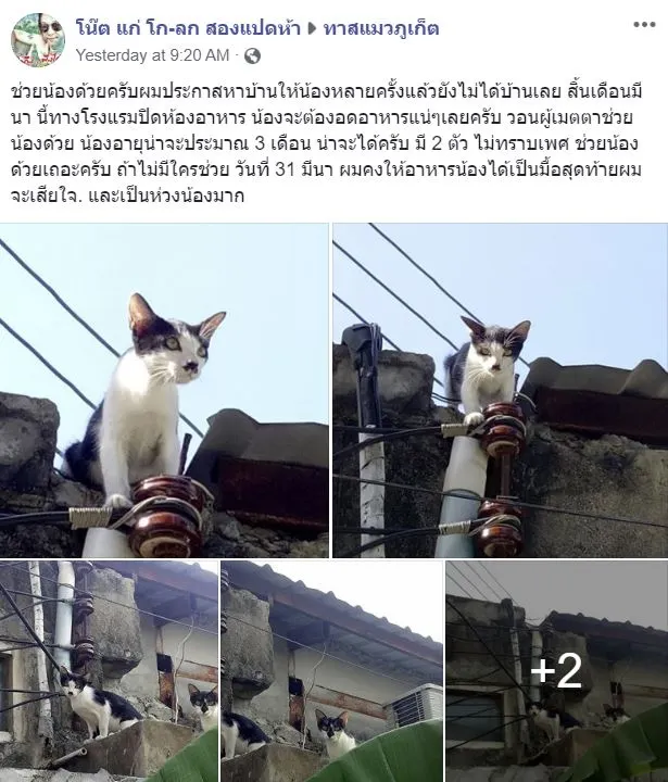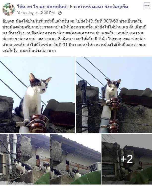 ผู้ใช้เฟซบุ๊ค โน๊ต แก่ โก-ลก สองแปดห้า ได้ใช้ช่องทางในโซเชี่ยล โพสต์ลงในกลุ่ม หาบ้านน้องแมว จังหวัดภูเก็ต เเละ ทาสแมวภูเก็ต ในการหาบ้านให้กับเจ้าเเมวเหมียวตัวน้อย อายุ3เดือน จำนวน3ตัว หวั่นพวกมันไม่มีอาหารกินอีกเเล้วนับตั้งเเต่สิ้นเดือนนี้