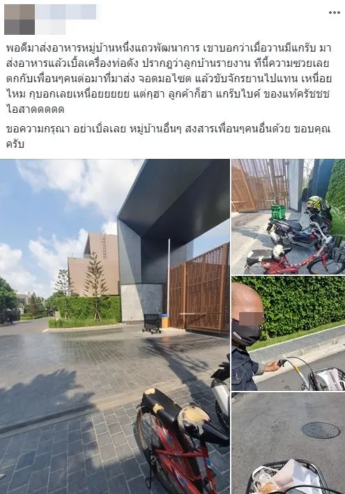 ผู้ใช้เฟซบุ๊กโพสต์ข้อความระบุว่า “พอดีมาส่งอาหารหมู่บ้านหนึ่งแถวพัฒนาการ เขาบอกว่าเมื่อวานมีแกร๊บ มาส่งอาหารแล้วเบิ้ลเครื่องท่อดัง ปรากฎว่าลูกบ้านรายงาน ทีนี้ความซวยเลยตกกับเพื่อนๆคนต่อมาที่มาส่ง จอดมอเตอร์ไซต์ แล้วขับจักรยานไปแทน เหนื่อยไหม กุบอกเลยเหนื่อยยยยย แต่กุฮา ลูกค้าก็ฮา แกร๊บไบค์ ของแท้ครัชชชไอสาดดดดด”