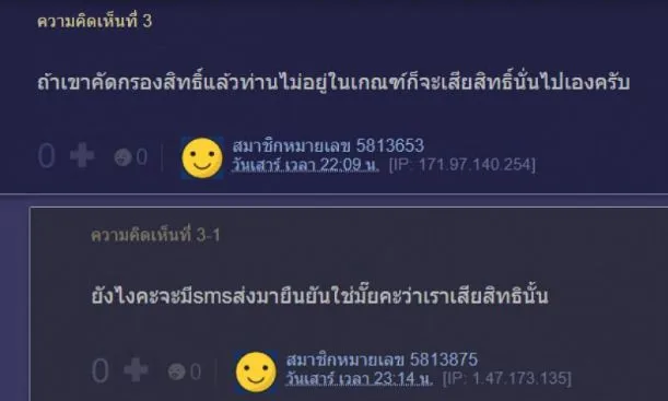 ล่าสุด สมาชิกหมายเลข 5814091 เว็บไซต์พันทิปได้ออกมาตั้งกระทู้ว่า อยากยกเลิกการลงทะเบียน เนื่องจาก ตัวเองเป็นนักศึกษา โดยจากโพสต์นั้นได้ระบุว่า “กดลงทะเบียนเสร็จเรียบร้อยแล้วแต่ไปเจอมาว่านักเรียนนักศึกษาไม่มีสิทธิ์ลงทะเบียน คือเราพึ่งจบปวช.แล้วไปสมัครปวส.มาแล้วด้วยค่ะ จะยกเลิกยังไงดีคะ”