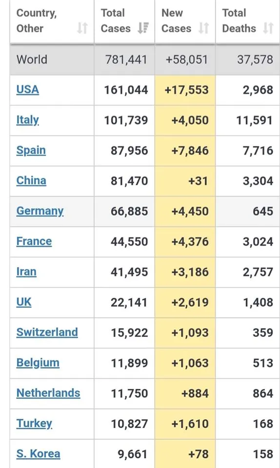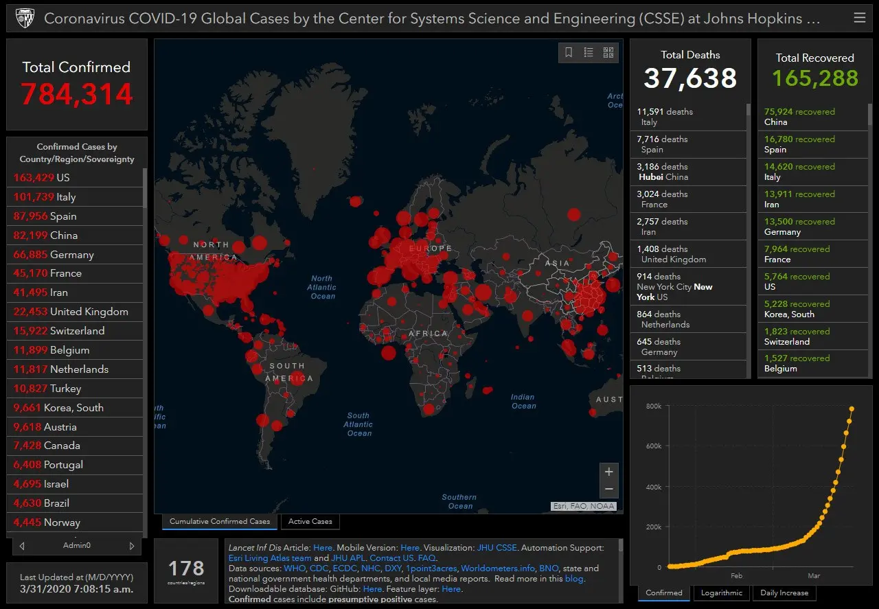 31 มีนาคม 2563 ตัวเลขผู้ติดเชื้อของอเมริกายังพุ่งขึ้นต่อเนื่อง ล่าสุดสูงถึง 163,429 คน มากที่สุดในโลก โดยมีผู้เสียชีวิตแล้ว 3,008 คน แต่รักษาหายเพียงแค่ 5,764 คนเท่านั้นในขณะนี้