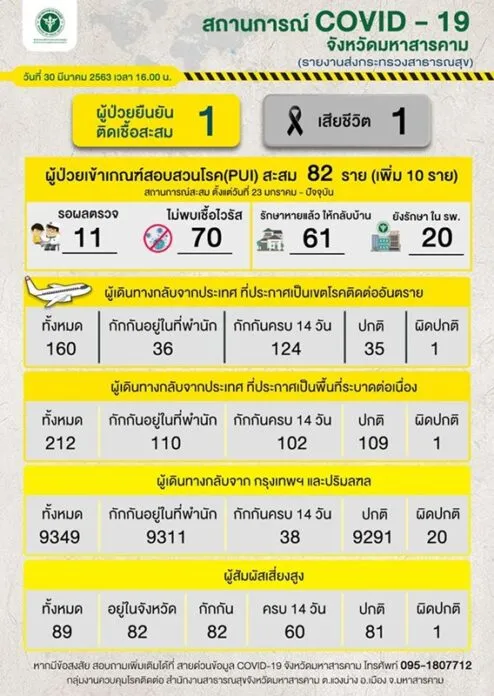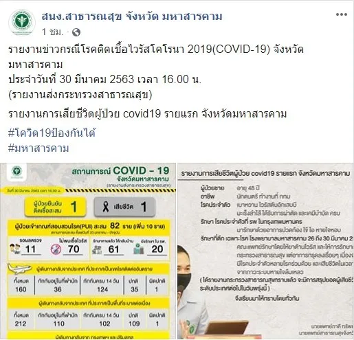 โดย เมื่อวันที่ 26 มี.ค. เข้า รพ.พยัคฆภูมิพิสัย จ.มหาสารคาม ปรากฏว่าติดเชื้อโควิด19อาการ มีไข้ ไอ เจ็บคอ มีเสมหะ หายใจเหนื่อยหอบ มีโรคประจำตัวคือ เบาหวาน มะเร็งลำไส้ ให้เคมีบำบัดครบแล้ว และไวรัสตับ อักเสบ มีไข้สูง ปอดติดเชื้อ 2 ข้าง ใส่เครื่องช่วยหายใจ และเสียชีวิตจากภาวะระบบหายใจล้มเหลวเมื่อวันที่ 30 มี.ค.ที่ผ่านมา