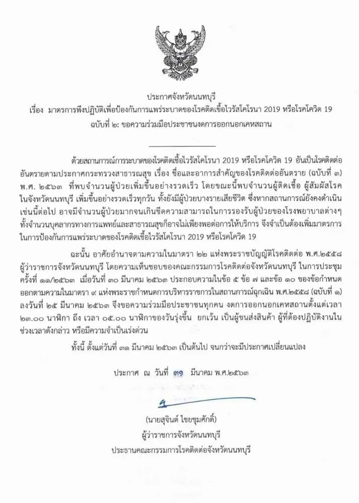 เมื่อวันที่ 31 มีค นายสุจินต์ ไชยชุมศักดิ์ ผู้ว่าราชการจังหวัดนนทบุรี ลงนามในประกาศ เรื่อง มาตรการพึงปฏิบัติเพื่อป้องกันการแพร่ระบาดของcovid19 ฉบับที่ 2 ขอความร่วมมือประชาชนงดการออกนอกเคหสถาน