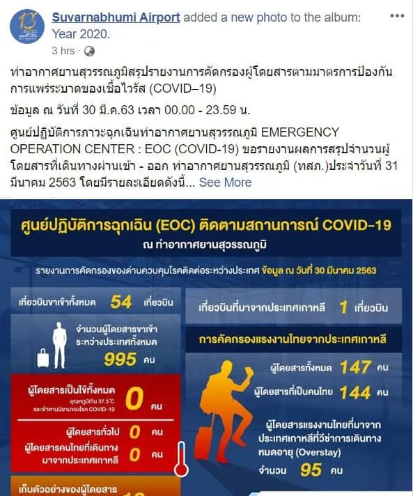 วันที่ 31 มีนาคม 2563 รายงานข่าวจากศูนย์ปฏิบัติการภาวะฉุกเฉินท่าอากาศยานสุวรรณภูมิ (EMERGENCY OPERATION CENTER หรือ EOC) เปิดเผยสรุปรายงานการคัดกรองผู้โดยสารตามมาตรการป้องกันการแพร่ระบาดของเชื้อไวรัสโคโรนา 2019 หรือโควิด-19 ของท่าอากาศยานสุวรรณภูมิ ว่า ผลการสรุปจำนวนผู้โดยสารที่เดินทางผ่านเข้า-ออก ท่าอากาศยานสุวรรณภูมิ ประจำวันที่ 31 มีนาคม 2563 โดยข้อมูลวันที่ 30 มีนาคม 2563 เวลา 00.00-23.59 น. นั้น