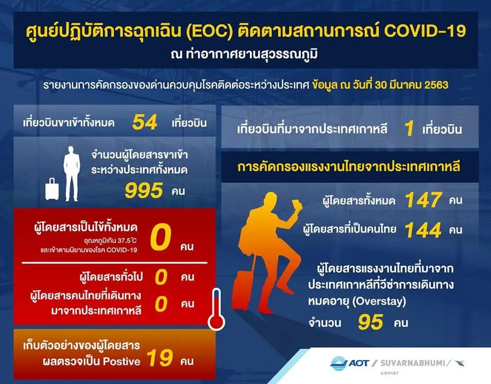 สำหรับการคัดกรองผู้โดยสารขาออก รวมทั้งสิ้น 6,302 คน พบผู้โดยสารเข้าเกณฑ์ PUI จำนวน 1 คน จึงได้นำส่งต่อโรงพยาบาล ทั้งนี้ ในวันที่ 30 มีนาคม 2563 มีเที่ยวบินที่มาจากประเทศเกาหลี จำนวน 1 เที่ยวบิน (KOREAN AIRLINES) มีจำนวนผู้โดยสารทั้งสิ้น 147 คน โดยเป็นผู้โดยสารคนไทยจำนวน 144 คน ซึ่งในจำนวนนี้มีผู้โดยสารที่เป็นแรงงานไทยที่เดินทางมาจากประเทศเกาหลี ที่มีวีซ่าการเดินทางหมดอายุ(Overstay) จำนวน 95 คนและตรวจไม่พบผู้โดยสารที่เข้าเกณฑ์ PUI