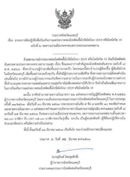 โดยระบุว่า ด้วยสถานการณ์การระบาดของ co vid 19 อันเป็นโรคติดต่ออันตรายตามประกาศกระทรวงสาธารณสุข เรื่อง ชื่อและอาการสำคัญของโรคติดต่ออันตราย ฉบับที่ 3 พศ 2563 ที่พบจำนวนผู้ป่วยเพิ่มขึ้นอย่างรวดเร็ว โดยขณะนี้พบจำนวนผู้ติดเชื้อ ผู้สัมผัสโรคในจังหวัดนนทบุรี เพิ่มขึ้นอย่างรวดเร็วทุกวัน ทั้งยังมีผู้ป่วยบางรายเสียชีวิต