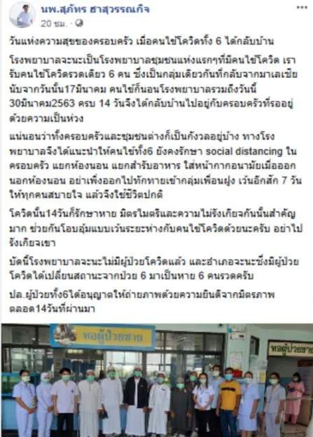 นับว่าเป็นอีกหนึ่งเรื่องราว ที่ถูกพูดถึงกันเป็นวงกว้าง เมื่อเฟสบุ๊คของ นพ สุภัทร ฮาสุวรรณกิจ ซึ่งเป็นผอ.โรงพยาบาลจะนะ จังหวัดสงขลา และ รองประธานชมรมแพทย์ชนบทภาคใต้ โพสต์ความสำเร็จในการรักษาผู้ป่วย Co vid 19 จำนวน 6 ราย ล่าสุดรักษาหายแล้ว ทุกคนสามารถกลับบ้านได้ แต่ติดปัญหาจะเป็นที่รังเกียจ โดยระบุข้อความว่า