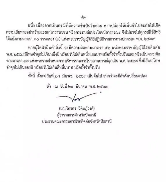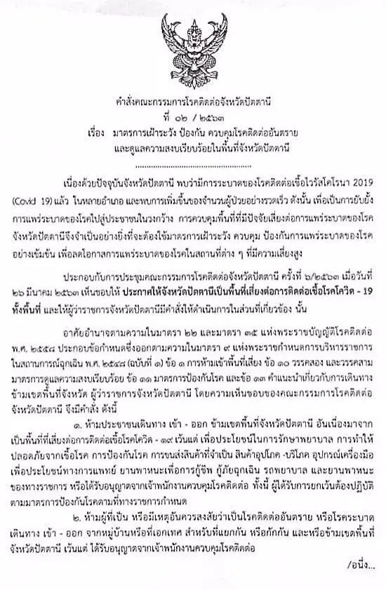 -ห้ามประชาชนเดินทาง เข้า ออก ข้ามเขตพื้นที่จังหวัดปัตตานี อันเนื่องมาจาก เป็นพื้นที่ที่เสี่ยงต่อการติดต่อเชื้อโรคโควิด 19 เว้นแต่ เพื่อประโยชน์ในการรักษาพยาบาล การทำให้ปลอดภัยจากเชื้อโรค การป้องกันโรค