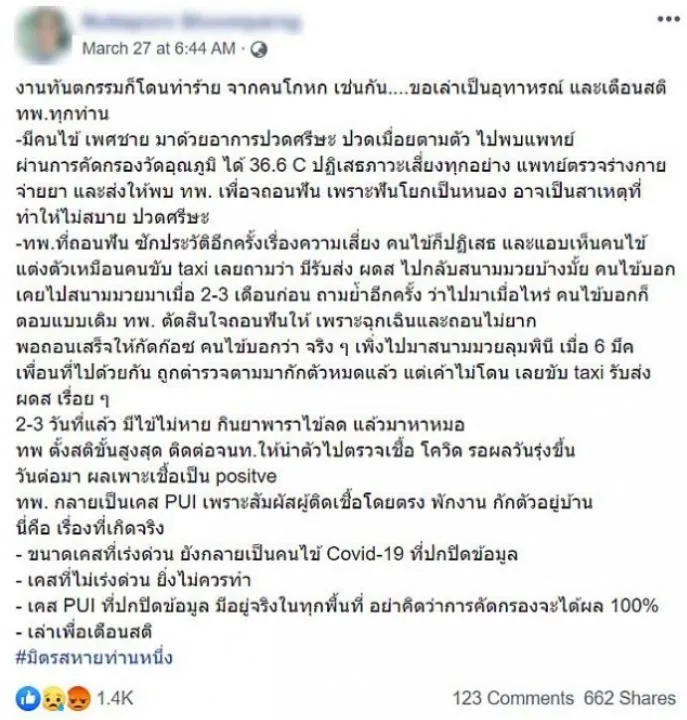 นี่คือเรื่องที่เกิดจริง ขนาดเคสที่เร่งด่วน ยังกลายเป็นคนไข้ Covid 19 ที่ปกปิดข้อมูล เคสที่ไม่เร่งด่วน ยิ่งไม่ควรทำ เคส PUI ที่ปกปิดข้อมูล มีอยู่จริงในทุกพื้นที่ อย่าคิดว่าการคัดกรองจะได้ผล 100 เปอร์เซ็น เล่าเพื่อเตือนสติ อนึ่ง ช่วงวันที่ 6 มีนาคม เป็นวันที่มีการจัดชกมวยที่เวทีมวยแห่งหนึ่ง และเกิดการแพร่เชื้อโควิด-19 จากสนามมวยดังกล่าวไปทั่วประเทศจนถึงปัจจุบัน และมีชีวิตหนึ่งในนั้นเกิดจากกลุ่มสนามมวยด้วย