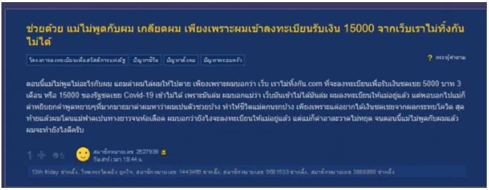 เกี่ยวกับเรื่องนี้ ล่าสุด สำหรับเรื่องราวที่ชาวโซเชียล เข้ามาแสดงความเห็นกันเป็นจำนวนมาก หลัง จากกระทู้ pantip com ตั้งโดย สมาชิกหมายเลข 2627939 ระบุว่าข้อความว่า ช่วยด้วย แม่ไม่พูดกับผม เกลียดผม เพียงเพราะผมเข้าลงทะเบียนรับเงิน 15000 จากเว็บเราไม่ทิ้งกันไม่ได้