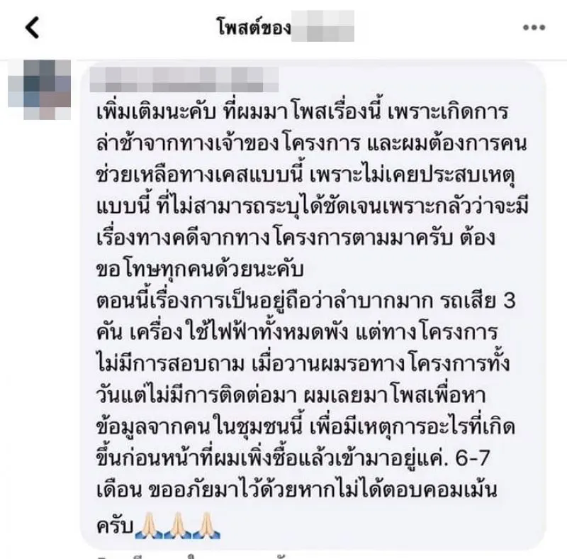 นอกจากนั้น ผู้โพสต์ยังบอกด้วยว่า หลังจากเกิดเรื่องขึ้นทางโครงการได้เข้ามาช่วยเหลือที่ค่อนข้างช้า จึงได้นำเรื่องมาโพสต์สอบถามว่าแบบนี้จะร้องทุกข์หรือเรียกร้องความเสียหายจากหน่วยงานไหนได้บ้าง