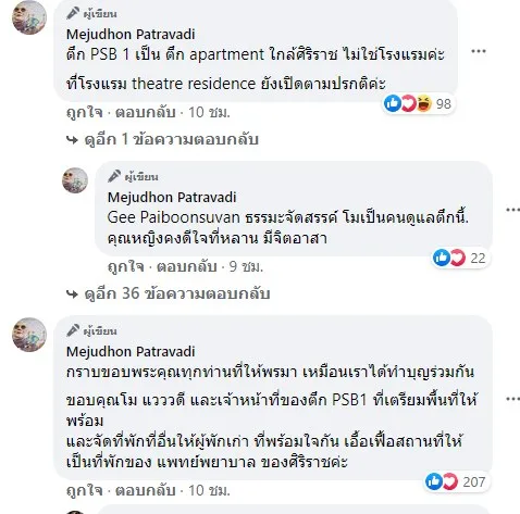 นอกจากนี้ ยังบอก ‘ขอบคุณโม แวววดี และเจ้าหน้าที่ของตึก PSB1 ที่เตรียมพื้นที่ให้พร้อม และจัดที่พักที่อื่นให้ผู้พักเก่า ที่พร้อมใจกัน เอื้อเฟื้อสถานที่ให้เป็นที่พักของ แพทย์พยาบาล ของศิริราชค่ะ’