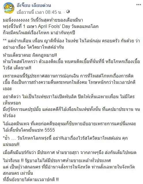 เเละล่าสุด นายเเพทย์ อัยการ เเละเพจชื่อดังอย่าง อีเจี๊ยบ เลียบด่วน นั้นก็ได้เตือนคนไทยทั้งประเทศ วันโกหก 1 เม.ย นี้ ใครแชร์ข่าวปลอมโควิด ติดคุก5ปี ปรับ1เเสนบาท
