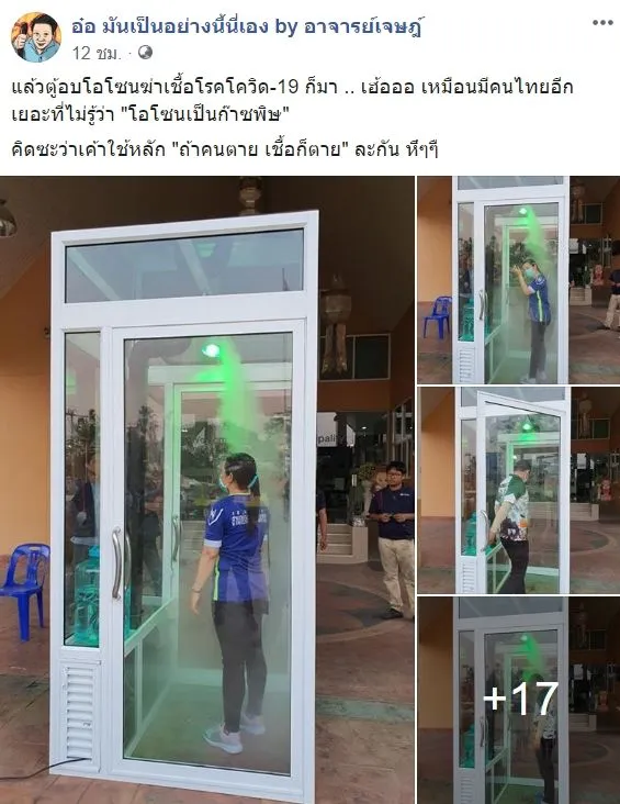 เพจเฟซบุ๊กโพสต์ข้อความระบุว่า “แล้วตู้อบโอโซนฆ่าเชื้อโรคโควิด-19 ก็มา .. เฮ้อออ เหมือนมีคนไทยอีกเยอะที่ไม่รู้ว่า “โอโซนเป็นก๊าซพิษ” คิดซะว่าเค้าใช้หลัก “ถ้าคนตาย เชื้อก็ตาย” ละกัน หึๆๆ”
