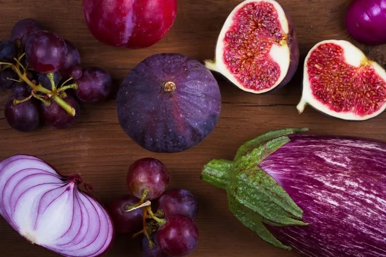 ผักผลไม้ที่มีสีม่วงและสีน้ำเงินมีสารสำคัญ คือ แอนโทไซยานิน (Anthocyanin) และสารกลุ่มฟีนอลิก (Phenolic acid) ผลไม้และผัก ที่มีสีม่วงและสีน้ำเงิน ได้แก่ องุ่นสีม่วง บลูเบอร์รี่ แบล็กเบอร์รี่ ลูกพรุน มะเขือม่วง กะหล่ำปลีสีม่วง มันสีม่วง ข้าวเหนียวดำ ข้าวลืมผัว เป็นต้น