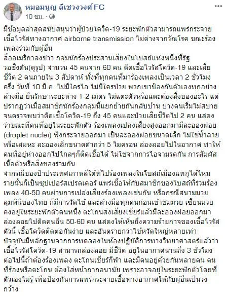 นพ.มนูญ ลีเชวงวงศ์ หัวหน้าประจำห้อง ICU โรคระบบการหายใจ ผู้ป่วยหนัก และโรคผู้สูงอายุโรงพยาบาลวิชัยยุทธ และประธานชมรมเชื้อราทางการแพทย์ประเทศไทย โพสต์เฟซบุ๊กระบุว่า ข้อมูลล่าสุดสนับสนุนว่าผู้ป่วยโควิด-19 ระยะฟักตัวสามารถแพร่กระจายเชื้อไวรัสทางอากาศ
