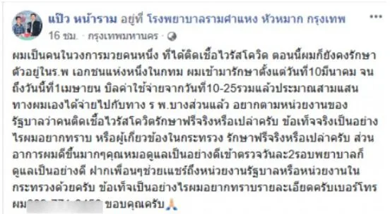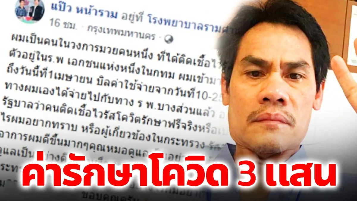 โดยเกี่ยวกับเรื่องนี้เมื่อวันที่ 1 เม ย เฟสบุ๊ค แป๊ว หน้าราม ได้โพสต์ระบุข้อความว่า ผมเป็นคนในวงการมวยคนหนึ่ง ที่ได้ติด CO VID ตอนนี้ผมก็ยังคงรักษาตัวอยู่ใน รพ เอกชนแห่งหนึ่งใน กทม ผมเข้ามารักษาตั้งแต่วันที่10มี ค จนถึงวันนี้ที่1เม ย บิลค่าใช้จ่ายจากวันที่ 10 – 25 รวมแล้วประมาณสามแสน ทางผมเองได้จ่ายไปกับทาง รพ บางส่วนแล้ว อยากตามหน่วยงานของรัฐบาลว่า คนติด รักษาฟรี จริงหรือเปล่าครับ