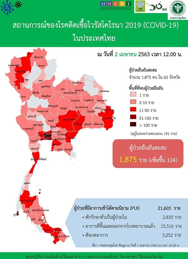ล่าสุด “นพ.ทวีศิลป์” กล่าวว่า “สำหรับสถานการณ์โรคโควิด-19 ระดับโลกมีผู้ป่วย 934,668 ราย เสียชีวิต 47,181 คน ขณะที่สหรัฐอเมริกา มีผู้ป่วย 214,482 ราย เป็นอันดับ 1 ของโลก เสียชีวิต 5 พันกว่าราย ขณะที่อิตาลีเสียชีวิตกว่า 13,000 ราย สเปน 9 พันกว่าราย เยอรมนี 6 พันกว่าราย สำหรับประเทศไทยข่วดีคือมีผู้รักาาหายกลับบ้านเพิ่ม 59 ราย รวมเป็น 505 ราย ส่วนผู้ป่วยรายใหม่วันนี้มี 104 ราย ส่งผลให้มีผู้ป่วยสะสม 1,875 ราย เสียชีวิตเพิ่มอีก 3 ราย รวมเป็น 15 ราย ได้แก่”