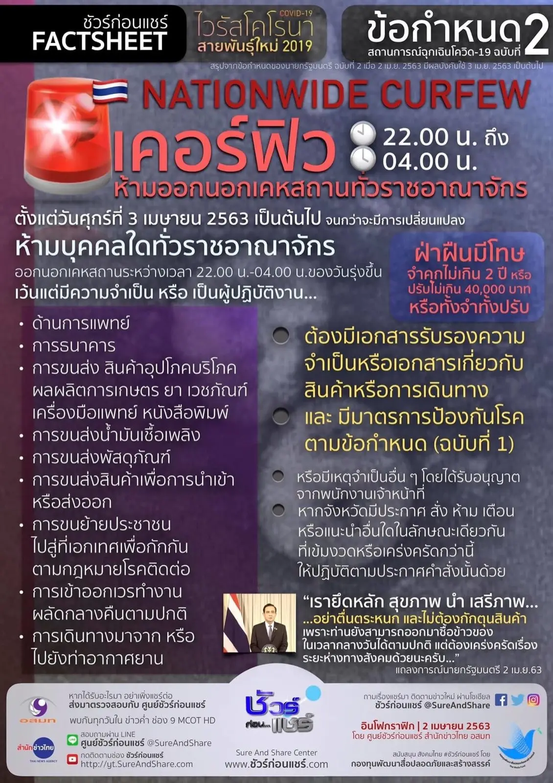 ทำเนียบรัฐบาล แจ้งสื่อว่า พลเอกประยุทธ์ จันทร์โอชา นายกรัฐมนตรี ได้แจ้งในที่ประชุมศบค. เรื่องการยกระดับมาตรการในการประกาศสถานการณ์ฉุกเฉินเพิ่มเติม โดยกำหนดเคอร์ฟิวทั่วประเทศระหว่างเวลา 22.00-04.00 น. ตั้งแต่วันศุกร์ 3 เม.ย. นี้เป็นต้นไป