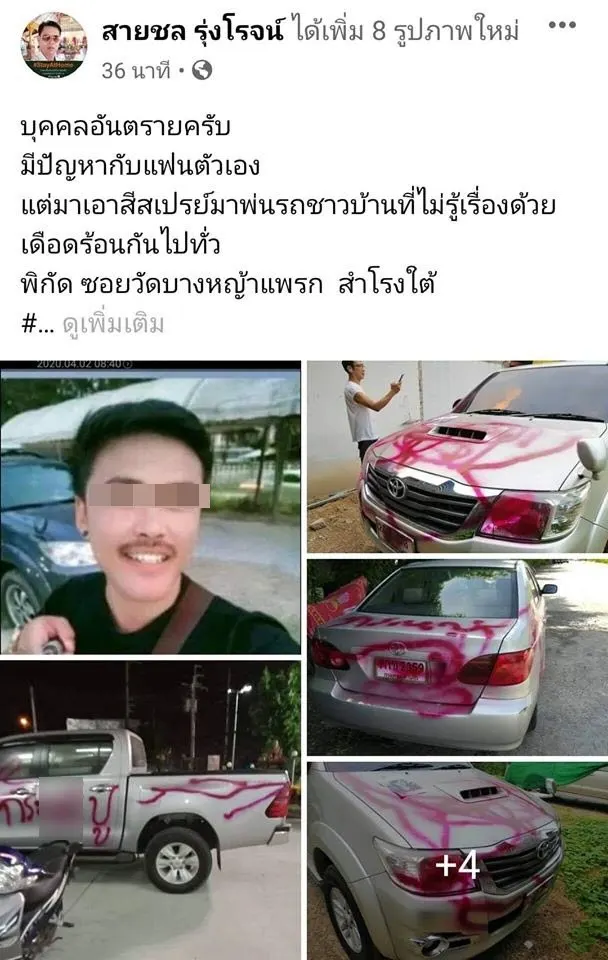 โดยเพจเฟซบุ๊ก สายชล รุ่งโรจน์ ได้โพสต์ภาพ พร้อมระบุข้อความว่า “แบบนี้ก็มีด้วย!? #ทะเลาะกับเมียตัวเองแต่ไปทำรถคนอื่น ชายมีปัญหากับแฟนตัวเอง แต่มาเอาสีสเปรย์มาพ่นรถชาวบ้านที่ไม่รู้เรื่องด้วย เดือดร้อนกันไปทั่ว พิกัด ซอยวัดบางหญ้าแพรก สำโรงใต้ #ใครพบแจ้ง สภ.สำโรงใต้ด้วยครับ”