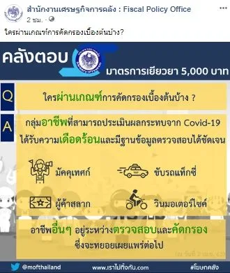วันนี้ (2 เมษายน 2563) ที่เพจ สำนักงานเศรษฐกิจการคลัง : Fiscal Policy Office ได้ตอบคำถามกรณีใครคนที่ผ่านเกณฑ์คัดกรองเบื้องต้นรับเงินเยียวยา 5,000 บาท คือกลุ่มอาชีพที่สามารถประเมิณผลกระทบจาก covid-19 ได้รับความเดือดร้อนและมีรากฐานข้อมูลตรวจสอบได้ชัดเจน อาชีพที่จะได้รับเงินเยียวยากลุ่มแรกได้แก่