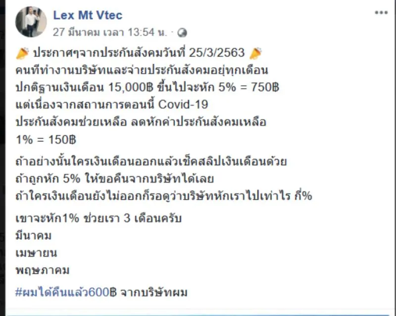ผู้สื่อข่าว รายงานว่า โลกออนไลน์มีการส่งต่อเรื่องราวเกี่ยวกับประกันสังคม โดยระบุข้อความว่า ประกาศๆจากประกันสังคมวันที่ 25 3 2563 คนทีทำงานบริษัทและจ่ายประกันสังคมอยุ่ทุกเดือน ปกติฐานเงินเดือน 15000 บาท ขึ้นไปจะหัก 5 เปอร์เซนต์ เท่ากับ 750 บาท แต่เนื่องจากสถานการตอนนี้ Cd 19 ประกันสังคมช่วยเหลือ ลดหักค่าประกันสังคมเหลือ 1 เปอร์เซนต์ เท่ากับ 150 บาท
