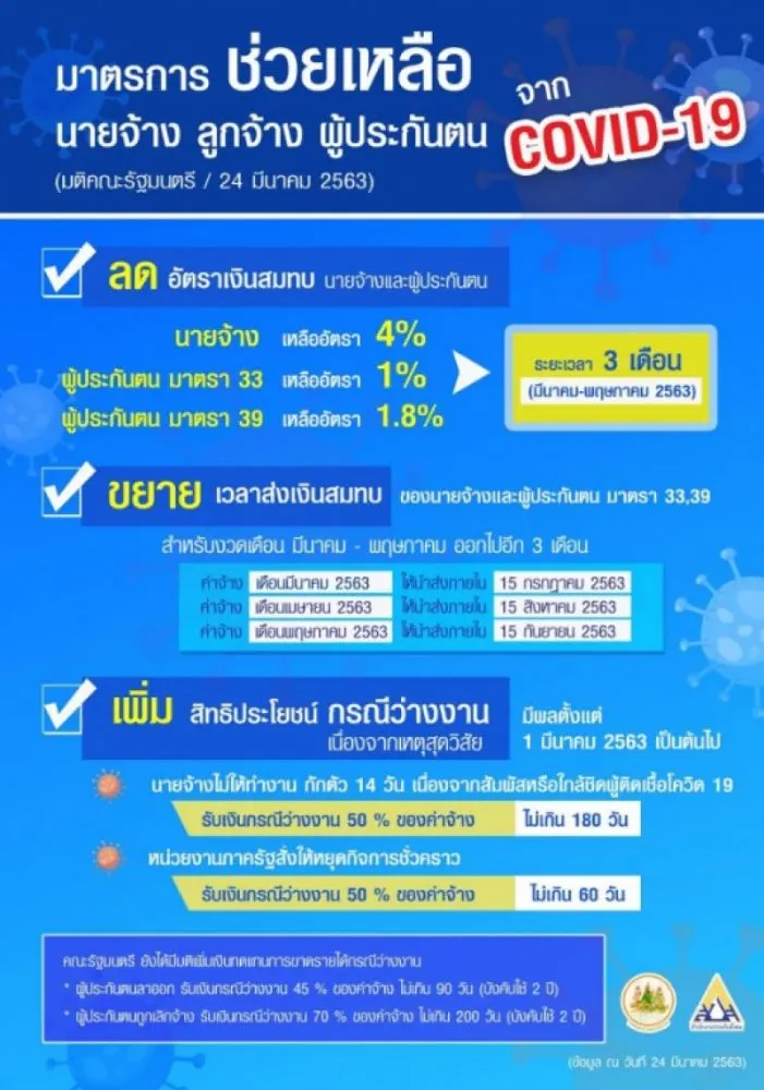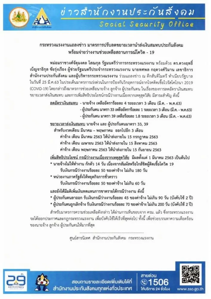 สำนักงานประกันสังคม กับมาตราการปรับลดการส่งเงินสมทบประกันสังคม วันที่ 24 มี.ค.2563 คณะรัฐมนตรีมีมติเห็นชอบ มาตรการปรับลดการส่งเงินสมทบประกันสังคมให้กับลูกจ้างให้เหลือ 1 เปอร์เซนต์ และนายจ้างให้เหลือ 4 เปอร์เซนต์ เป็นระยะเวลา 3 เดือน โดยมีแผนจะเริ่มตั้งแต่มีนาคม ถึง พฤษภาคม 2563 โดยขณะนี้อยู่ระหว่างรอประกาศใช้เป็นกฎหมายต่อไป