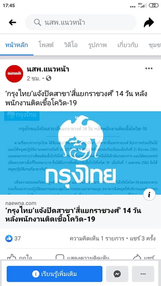 และข่าววันนี้ จากนสพ. แนวหน้า แจ้งว่า พบ พนง. แบงก์กรุงไทย สาขาสี่แยกราชวงศ์ ติด จำต้องปิดสาขานี้ 14 วัน
