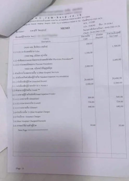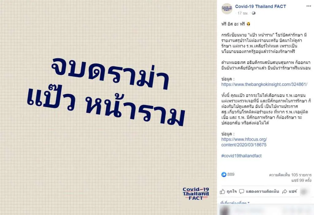 ล่าสุด เพจเฟซบุ๊ก Covid-19 Thailand FACT ได้โพสต์เกี่ยวกับกรณีดังกล่าวว่า “ฟรี อิส อะ ฟรี กรณีเซียนมวย แป๊ว หน้าราม โชว์บิลค่ารักษา มีรายงานสรุปว่าไม่ต้องจ่ายนะครับ บิลมาให้ดูค่ารักษา แต่ทาง ร.พ.เคลียร์ให้หมด เพราะเป็นนโยบายของภาครัฐอยู่แล้วว่าต้องรักษาฟรี ด้านหมอธเรศ อธิบดีกรมสนับสนุนสุขภาพ ก็ออกมายืนยันว่าเคลียร์ปัญหาแล้ว ยืนยันว่ารักษาฟรีแน่นอน