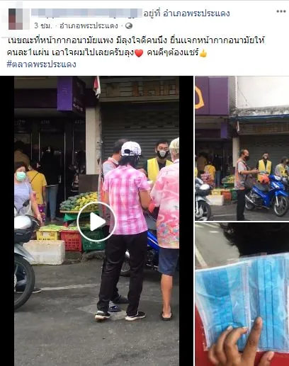 โดยผู้ใช้เฟซบุ๊ค ได้โพสต์ข้อความระบุว่า ” ในขณะที่หน้ากากอนามัยแพง มีลุงใจดีคนนึง ยื่นเเจกหน้ากากอนามัยให้คนละ1แผ่น เอาใจผมไปเลยครับลุง คนดีๆต้องแชร์ #ตลาดพระประแดง”