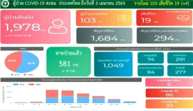 ขณะที่ประเทศไทยอยู่อันดับที่ 37 โดยผู้ป่วยสะสม 1,978 ราย, รักษาหาย 581 ราย, พบป่วยเพิ่ม 103 ราย, เสียชีวิตเพิ่ม 4 ราย รวมเสียชีวิต 19 ราย ซึ่งผู้ที่เสียชีวิตเพิ่ม 4 ราย มีรายละเอียดดังนี้