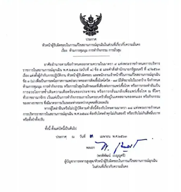 ในวันนี้ (3 เม.ย.2563) พล.อ.พรพิพัฒน์ เบญญศรี ผู้บัญชาการทหารสูงสุด หัวหน้าผู้รับผิดชอบในการแก้ไขสถานการณ์ฉุกเฉินในส่วนที่เกี่ยวข้องกับความมั่นคง ลงนามในประกาศ เรื่อง ห้ามการชุมนุม การทำกิจกรรม การมั่วสุม อาศัยอำนาจตามข้อกำหนดออกตามความในมาตรา 9 แห่งพระราชกำหนดการบริหารราชการในสถานการณ์ฉุกเฉิน พ.ศ.2548 (ฉบับที่ 1) ข้อ 5 และคำสั่งสำนักนายกรัฐมนตรี ที่ 4/2563 เรื่อง แต่งตั้งผู้กำกับการปฏิบัติงาน หัวหน้าผู้รับผิดชอบ และพนักงานเจ้าหน้าที่ในการแก้ไขสถานการณ์ฉุกเฉิน ข้อ 3 (2) เพื่อเป็นการลดโอกาสการแพร่ระบาดของการติดเชื้อโรค COVID-19 ไม่ให้ขยายไปในวงกว้าง จึงกำหนดห้ามการชุมนุม การทำกิจกรรม หรือการมั่วสุมในลักษณะที่เสี่ยงต่อการแพร่เชื้อโรค หรือการกระทำอันเป็นการฉวยโอกาสซ้ำเติมความเดือดร้อนของประชาชน หรือการกลั่นแกล้งเพื่อแพร่เชื้อโรค ณ ที่ใด ๆ ทั่วราชอาณาจักร เว้นแต่เป็นการทำกิจกรรมภายในครอบครัวที่อยู่ในเคหสถานของตนเอง หรือกิจกรรมของทางราชการ ซึ่งมีมาตรการเว้นระยะห่างระหว่างบุคคลที่ปลอดภัย หากผู้ใดฝ่าฝืนหรือไม่ปฏิบัติตามคำสั่งนี้ต้องรับโทษตามมาตรา 18 แห่งพระราชกำหนดการบริหารราชการในสถานการณ์ฉุกเฉิน พ.ศ.2548 ต้องรับโทษจำคุกไม่เกิน 2 ปี หรือปรับไม่เกิน 40,000 บาท หรือทั้งจำทั้งปรับ ทั้งนี้ ตั้งแต่บัดนี้เป็นต้นไป