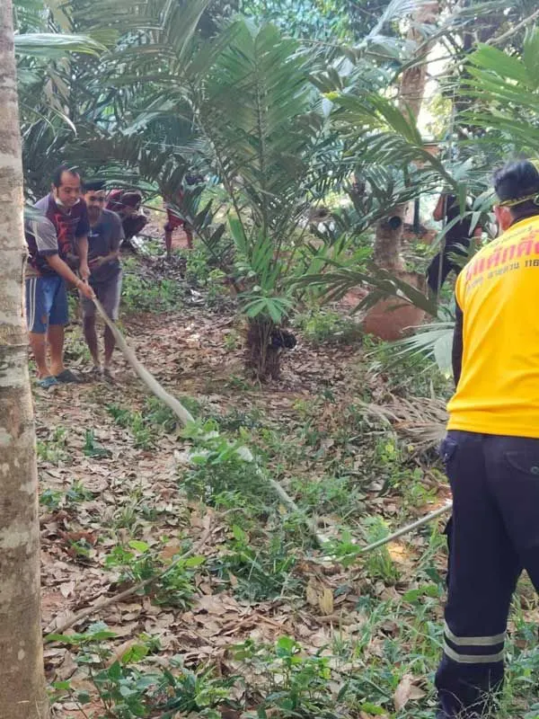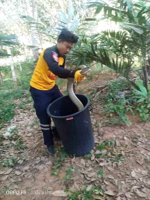 โดย น.ส.วรรณี มสันต์ อายุ 34 ปี อยู่บ้านเลขที่ 70 หมู่ 4 ต.บ้านลำนาว อ.บางขัน พร้อมกับครอบครัวได้นำเจ้าหน้าที่กู้ภัยไปยังสถานที่พบงูซึ่งอยู่ภายในสวน ซึ่งบริเวณใต้ต้นไม้ก็ได้เห็นเจ้างูจงอางขนาดใหญ่เลื้อยอยู่ ซึ่งเจ้าหน้าที่รอจังหวะ ก่อนจะช่วยกันจับเอาไว้ได้ นำมาวัดความยาวเจ้างูยักษ์มีขนาดเกือบ 5เมตร ถือว่าใหญ่มาก
