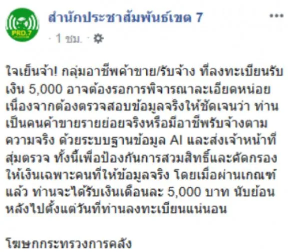 เนื่องจากต้องตรวจสอบข้อมูลจริงให้ชัดเจนว่า ท่านเป็นคนค้าขายรายย่อยจริงหรือมีอาชีพรับจ้างตามความจริง ด้วยระบบฐานข้อมูล AI และส่งเจ้าหน้าที่สุ่มตรวจ