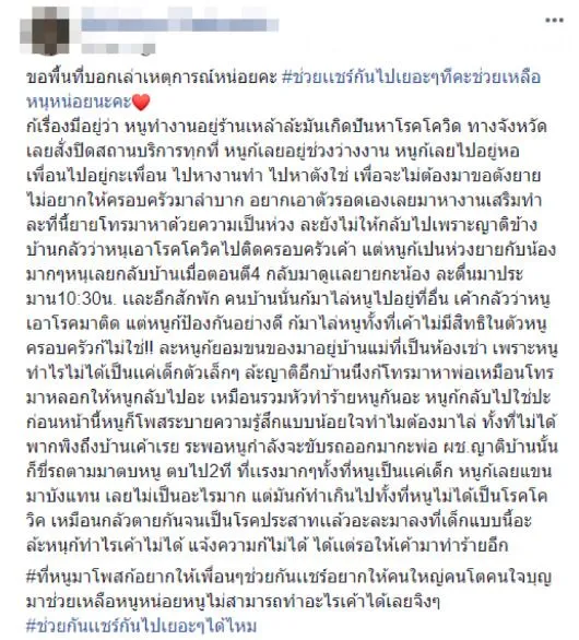 ขอพื้นที่บอกเล่าเหตุการณ์หน่อยคะ ช่วยเเชร์กันไปเยอะๆทีคะช่วยเหลือหนูหน่อยนะคะ ก็เรื่องมีอยู่ว่า หนูทำงานอยู่ร้านเหล้าละมันเกิดปัญหาโรคโควิด