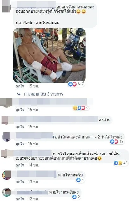จนต่อมาภายหลังก็มีชาวเน็ตท่านหนึ่งได้โพสต์อัพเดทอาการคุณตา โดยได้โพสต์รูปภาพพร้อมทั้งระบุข้อความว่า… อยู่แถววัดศาลาลอยค่ะ ลุงบอกสบายๆค่ะพรุ่งนี้ก็วิ่งรถได้แล้ว