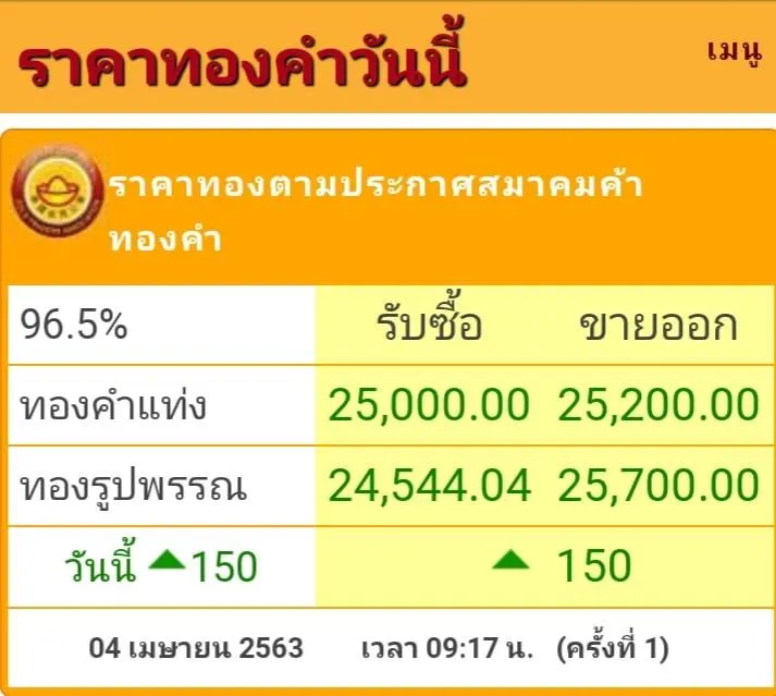 ราคาทองเพิ่มขึ้น 150 บาท ราคาทองรูปพรรณ รับซื้อบาทละ 24,544.00 บาท ขายออกบาทละ 25,700.00 บาท ราคาทองคำแท่ง รับซื้อบาทละ 25,000.00 บาท ขายออกบาทละ 25,200.00 บาท
