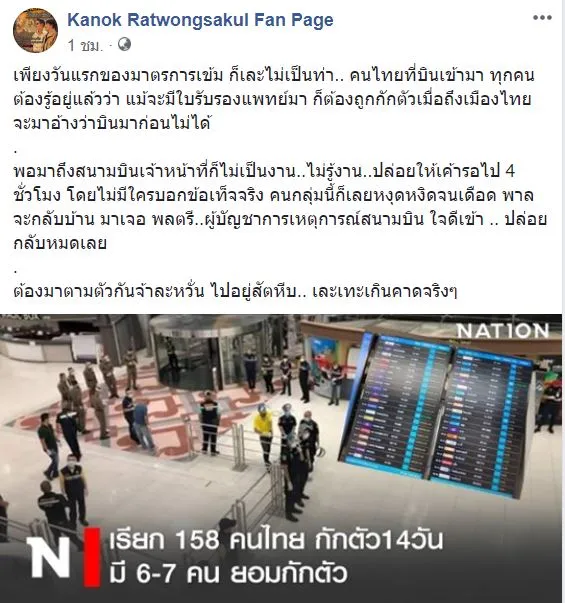 ล่าสุดบนเฟซบุ๊กของผู้ประกาศข่าวชื่อดังอย่าง กนก รัตน์วงศ์สกุล ได้โพสต์ถึงความเละเทะของมาตรการนี้ว่า