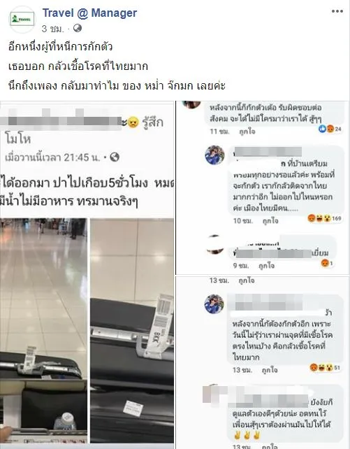 ล่าสุด วันนี้ 4 เม.ย. เพจ “Travel @ Manager” โพสต์รูปภาพของเฟซบุ๊กสาวไทยรายหนึ่งชื่อว่า โดยเธอโพสต์ว่า “กว่าจะได้ออกมา ปาไปเกือบ 5 ชั่วโมง หมดแรงค่ะ ไม่มีน้ำไม่มีอาหารทรมานจริงๆ” ซึ่งเธอเป็นหนึ่งในบุคคลที่ลักลอบหนีออกมาจากกระบวนการกักตัว ภายในท่าอากาศยานสุวรรณภูมิ นอกจากนี้ เธอเองยังได้คอมเมนต์คุยกับเพื่อน โดยอ้างว่า ที่บ้านเตรียมพร้อมทุกอย่าง พร้อมที่จะกักตัว ซึ่งกลัวว่า ตนจะติดเชื้อจากประเทศไทยมากกว่า