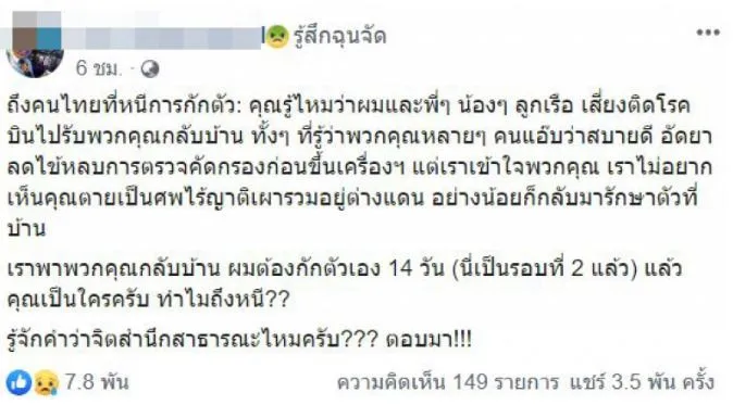 ถึงคนไทยที่หนีการกักตัว คุณรู้ไหมว่าผมและพี่ๆ น้องๆ ลูกเรือ เสี่ยงติด บินไปรับพวกคุณกลับบ้าน ทั้งๆ ที่รู้ว่าพวกคุณหลายๆ คนแอ๊บว่าสบายดี อัดลดไข้หลบการตรวจคัดกรองก่อนขึ้นเครื่องฯ แต่เราเข้าใจพวกคุณ เราไม่อยากเห็นคุณไปอย่างไร้ญาติรวมอยู่ต่างแดน อย่างน้อยก็กลับมารักษาตัวที่บ้าน