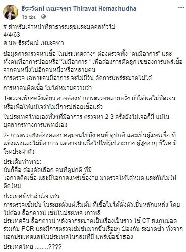 เมื่อวันที่ 4 เมษายน 2563 ที่ผ่านมา ศ.นพ.ธีระวัฒน์ เหมะจุฑา ได้มีการโพสต์ข้อความผ่านเฟสบุ๊ค ธีระวัฒน์ เหมะจุฑา Thiravat Hemachudha ระบุข้อความว่า.. สำหรับเจ้าหน้าที่สาธารณสุขและบุคคลทั่วไป 4/4/63 ศ นพ ธีระวัฒน์ เหมะจุฑา