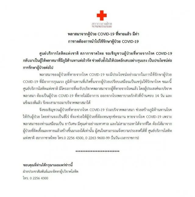 จึงขอเชิญชวนผู้ป่วยที่หายจากโรค COVID-19 ร่วมบริจาคพลาสมา ช่วยสร้างภูมิต้านทานโรคให้กับผู้ป่วย โดยท่านจะเป็นฮีโร่ ที่จะช่วยให้ผู้ป่วยที่ต้องทนทุกข์ทรมาน หายจากโรด COVD-19 เพราะพลาสมาของท่านเสมือนเป็น ยาวิเศษ มีคุณค่าอย่างมหาศาล และไม่สามารถหาได้จากที่ใด ต้องได้มาจากผู้ป่วยที่ติดเชื้อและหายแล้วสร้างขึ้นมาเองได้เท่านั้นผู้สนใจสามารถแจ้งความประสงค์ได้ที่ ศูนย์บริการโลหิตแห่งชาติ สภากาชาดไทย โทร.0 2256 4300, O 2263 9600-99 (ในวัน-เวลาราชการ)