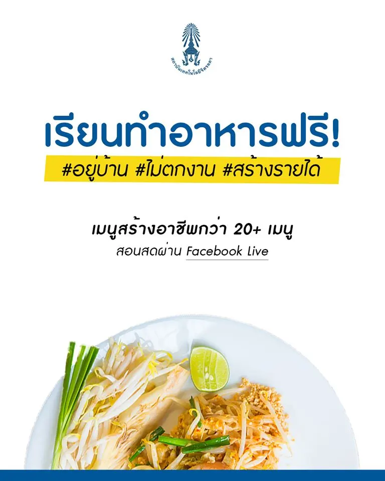 สำหรับใครที่ตกงาน อยากมีอาชีพ หรืออยู่บ้านว่างๆอยากฝึกทำอาหาร สถาบันเทคโนโลยีจิตรลดา เปิดคอร์สสอนทำอาหาร เรียนฟรี ไม่มีค่าใช้จ่ายมีเมนูสร้างอาชีพ 20 กว่า เมนูเรียนออนไลน์ไม่ต้องออกจากบ้าน สอนสดผ่านทาง Facebook Live เริ่มวันแรก อังคารที่ 7 เมษายน 13.00 น.